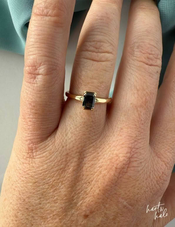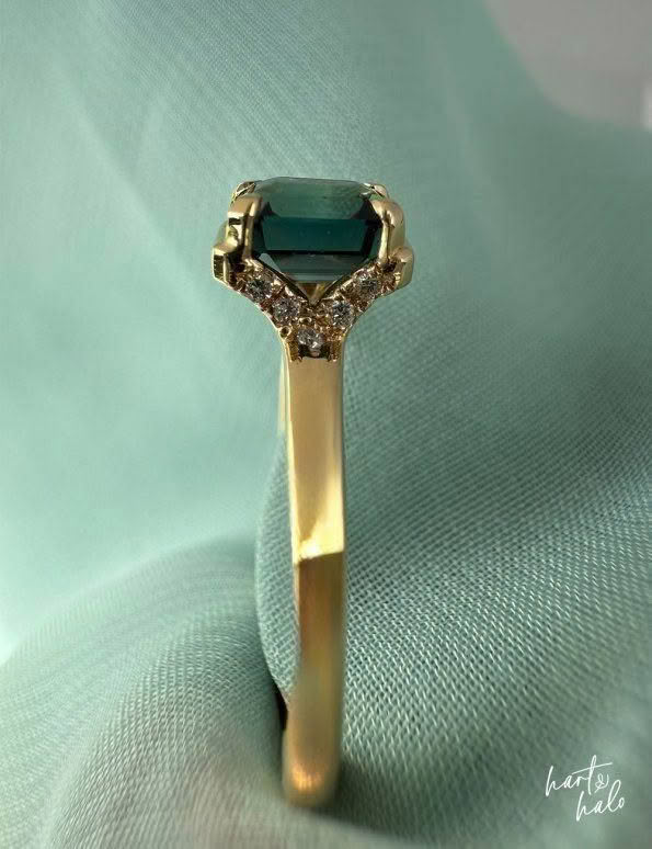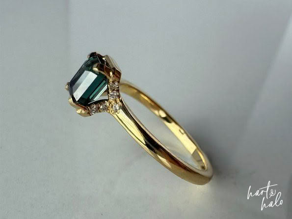 Jessica wanted a half-bezel design which was intended for a much larger stone, one which could afford to lose a bit of length by the nature of how it was held in the setting. Jessica’s stone was a perfect 1ct precious Sapphire and we wanted to held her up and adore the full perfect natural form. So we put our thinking caps on to come up with ideas on how we could get the best of both worlds. We found a solution where Jessica would get the look of the semi-bezels but with the addition of 4 flat prongs we were able to hold that beautiful Sapphire tightly in place and up out of the bezels for full display and adoration.
