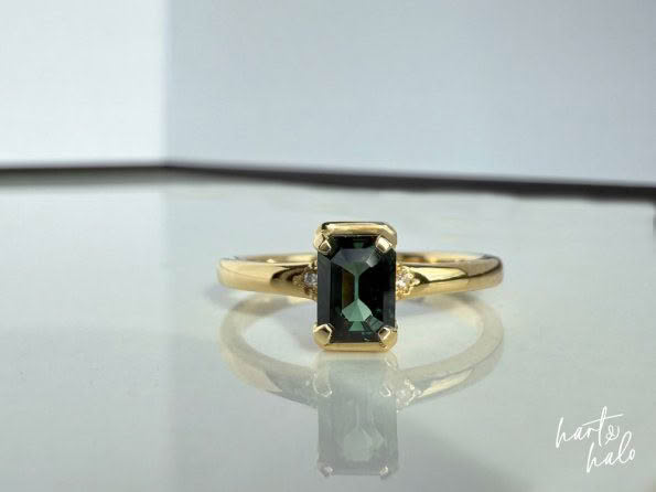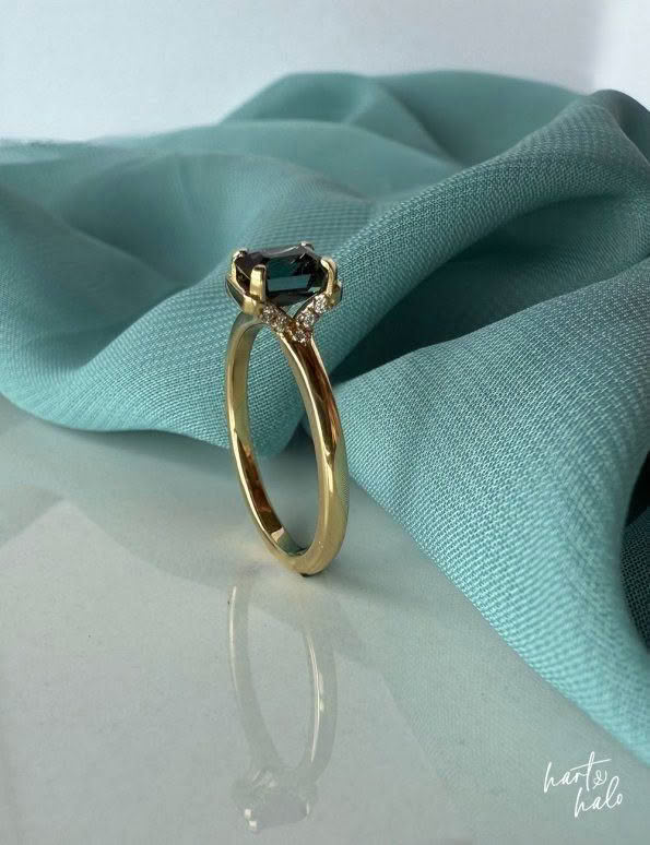 Having always adored Green Sapphire, Jessica dreamed of a design to feature a gorgeous Green Sapphire solitaire with 10 wee Diamonds placed down the band – to symbolise their 10 years of marriage! She knew exactly what she wanted (had put together a document with descriptions and pictures even – perfect!!) and was being drawn to a particular hue of Green, so we contacted our suppliers around the world to see if we could find it. We did! Always exciting when you find ‘the one’. A natural borne Sapphire made millions of years ago, found its person.