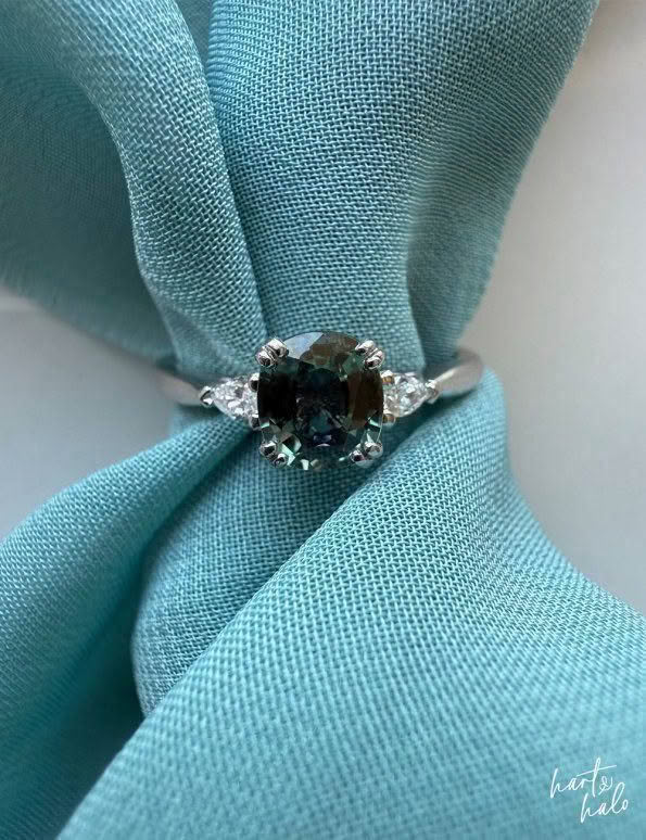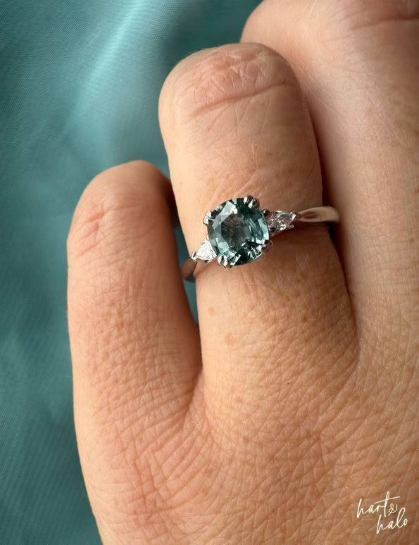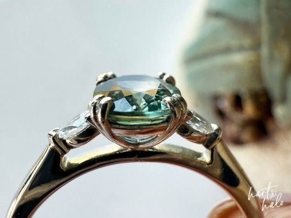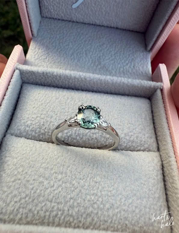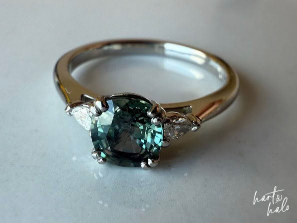 We started with the centre stone. The shape and cut of this would determine the side stones for her design. Daz had been drawn to a beautiful sage Green Sapphire in a cushion cut on our website. She was a little unsure if it was dark enough but we sent through a few more images for her, along with a number of other options. She managed to narrow it down to two, including the one she’d been drawn to, and to help with the decision we modelled them with a number of side stone options to get that ‘final look’. The original Sapphire she’d picked from our website it was, and a cute pear Diamond either side worked beautifully with the soft cushion curves. Winner!