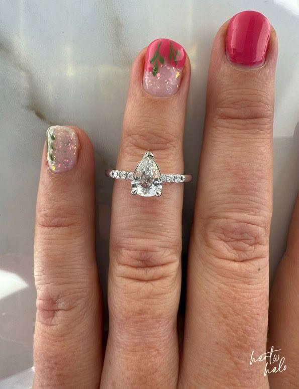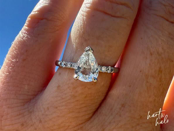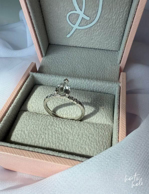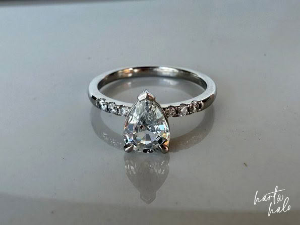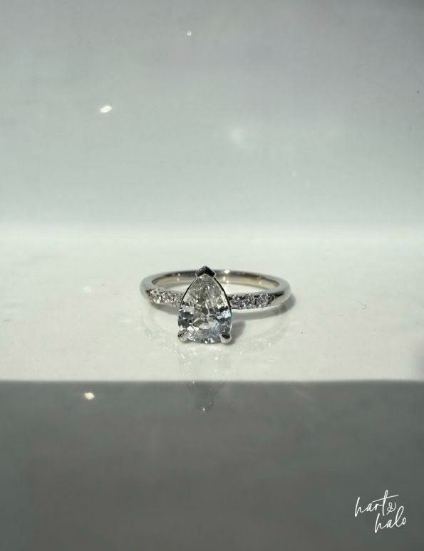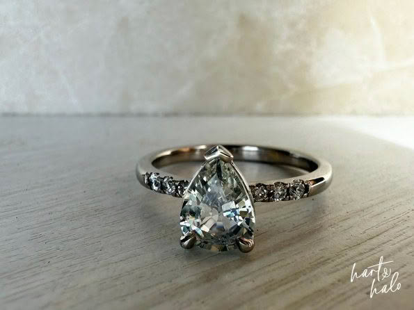 Helenna had her eye on this white Pear Sapphire for quite a while. After having ‘the chat’ to her partner Mitch and discussing that maybe it could be time, Helenna came straight to us to design her dream ring! She wanted something timeless and classic, but with a little bit of difference – her stamp of individuality.