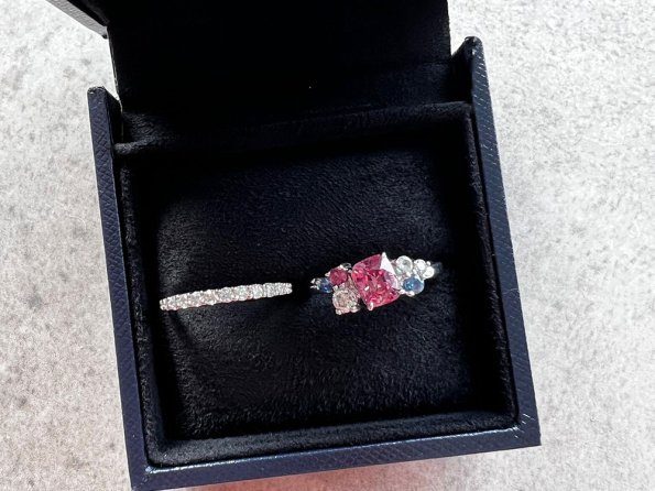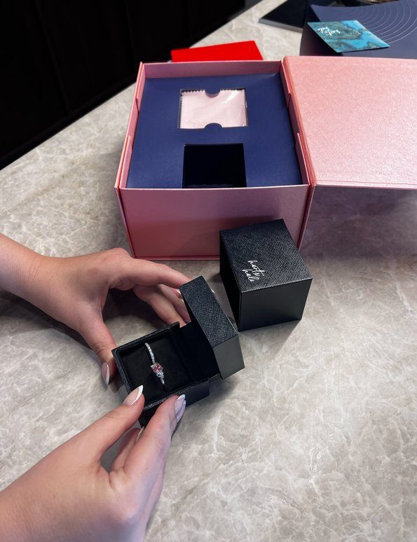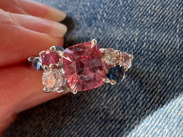 The ring: Kristen picked her favourite coloured sapphire for the centre stone – a gorgeous warm and vivacious padparadscha. She’d always liked corally colours, in fact this had been their wedding colour. Kristen was after an assymetrical design and liked the idea of having her centre stone tilted which gave off a real playful vibe. The cluster came next. Kristen carefully handselected 4 sapphires to represent each of her children, these plus her original engagement diamond (which represented her husband) and a smaller wee diamond (their dog) were carefully placed around the centre stone to achieve balance and the desired aesthetic.