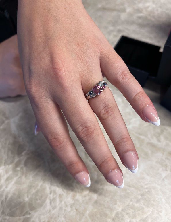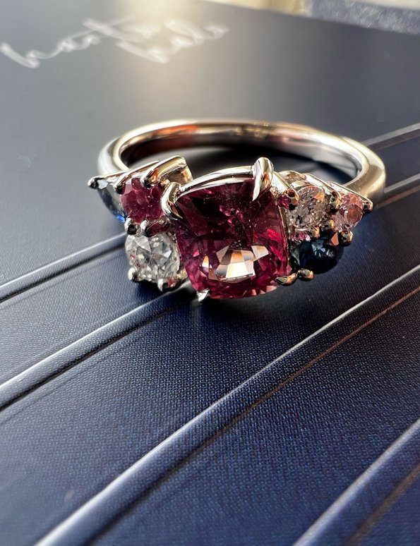 Recently Kristen and Marc were at their friends engagement party where everyone was ogling over the ring. Marc asked Kristen to show everyone hers, more just as a wow, look at the comparison, but it did get Marc wondering again whether Kristen really was happy with her ring. Kristen replied that yeh, she didn’t care but could perhaps one day look at getting it reset. That seed was planted and not too much later she came across Hart & Halo! Kristen really identified with the essence of Hart & Halo and felt a coloured sapphire cluster ring would be a lovely treat. Moreover, after contacting Hart & Halo and having a chat about her story and what she was after, she really liked the idea that the cluster could represent her now finished family.