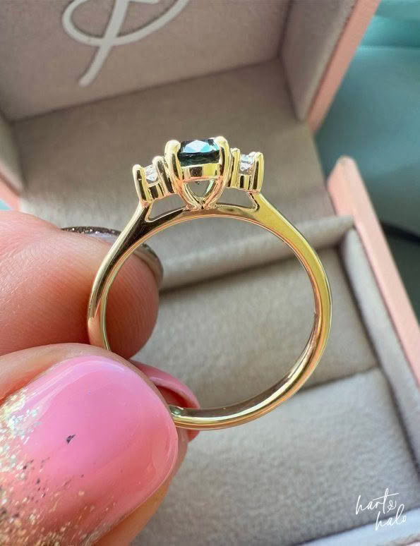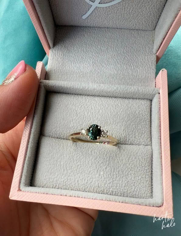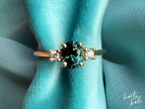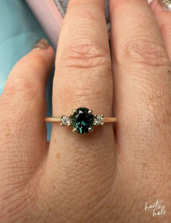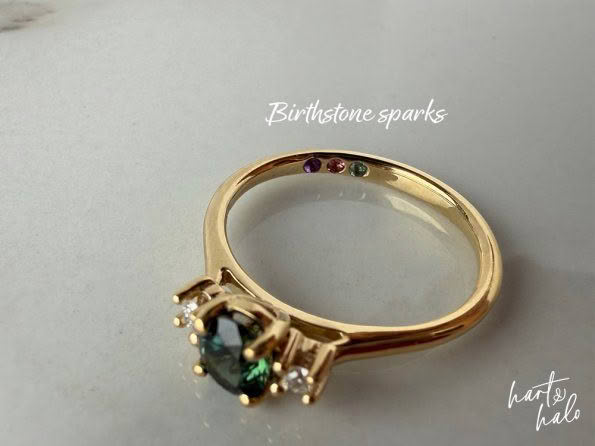 S contacted us and we discussed options. After a bit of thought she opted for a Green Sapphire, to honour the green colour of her original ring but also ensure the stone was as strong and hardy as possible. We went ahead and sourced a number of options and she chose this gorgeous Australian Teal Green Sapphire. Super bright and clean – straight out of the ground in Toomahawk Creek, Queensland – an absolute treasure! S decided to add a couple of wee Diamonds to the design this time, and we held these up high with the Sapphire in a cathedral setting. The final detail was to set her family’s birthstones into the inside of the band.