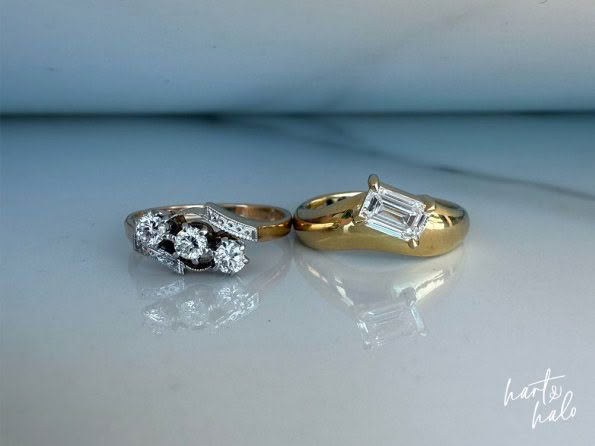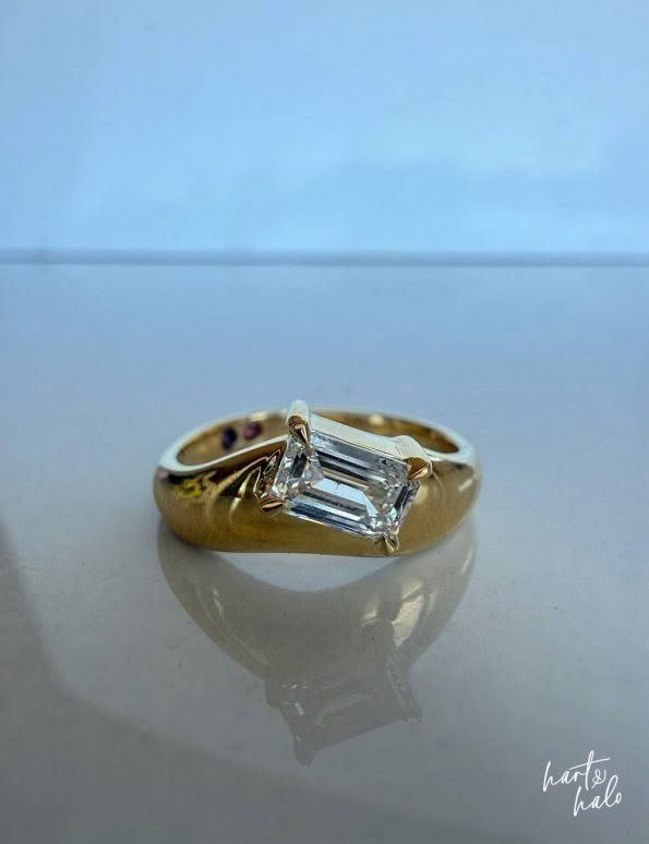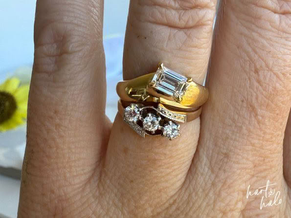 When it came to planning for the wedding ring, Sophie knew she’d have to get a custom made ring to fit the unique shape of her grandmothers ring. She wanted a chunky organic design – smooth wavy curves as if it had simply been molten and set. She’d always loved the Emerald cut, so decided to tuck a Diamond half-way into the top, offsetting the trio of Diamonds on her grandmother’s ring.