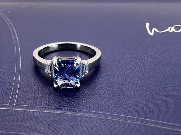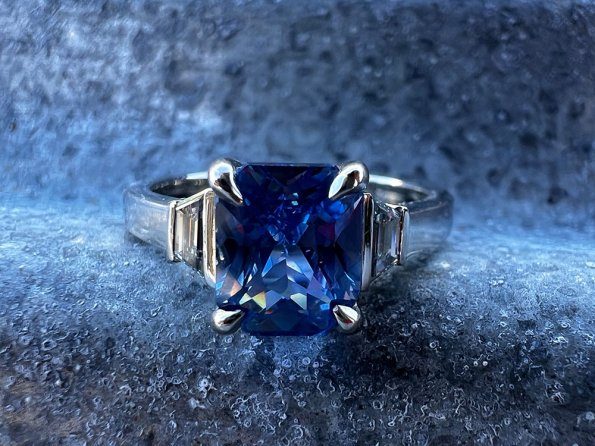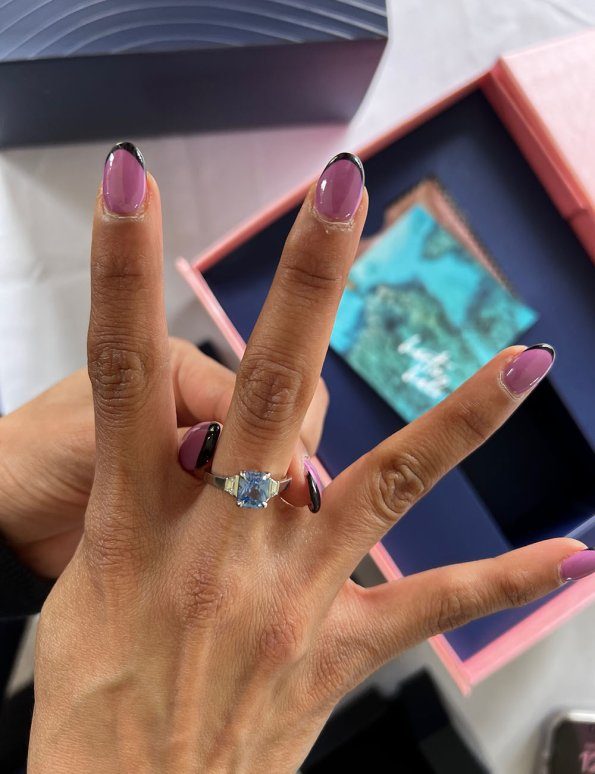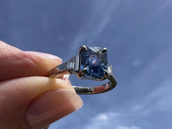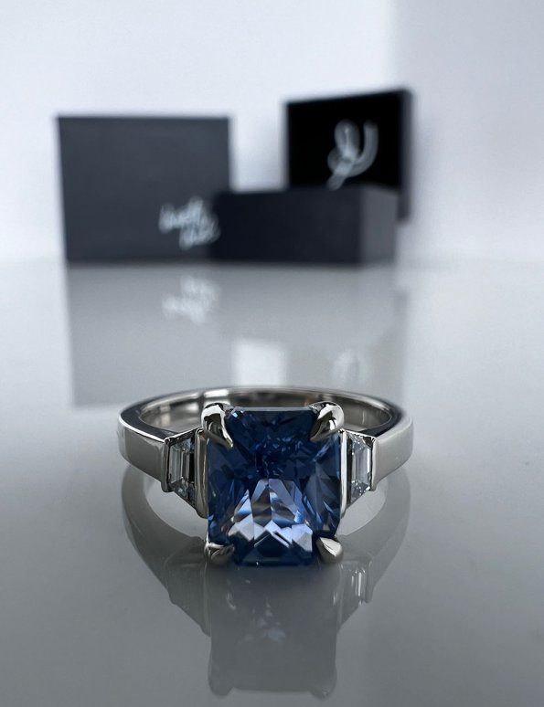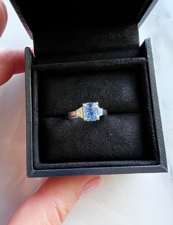 The ring: Rachel wanted something that ‘popped’, something that stood out and attracted attention. She is proud of herself and her resilience, and wanted to be reminded of that. Rachel chose a beautiful radiant sky blue Sapphire in a line up of gorgeous stones. She said it was a hard decision but she was after a stunning light blue and this one stood out and called her in. Rachel wanted the piece to be solid and stately, she chose to nestle a trapezoid diamond either side of her Sapphire with strong half-bezels which gave it a bold, solid look. To add to this, she chose a square shaped band which again added to the feeling of strength.