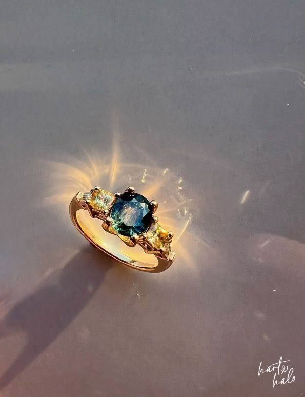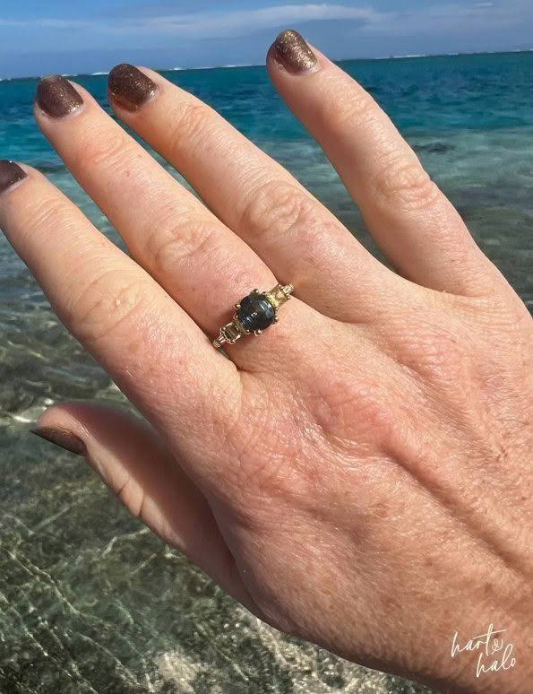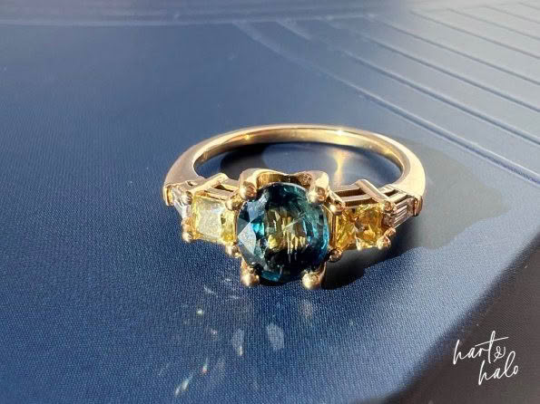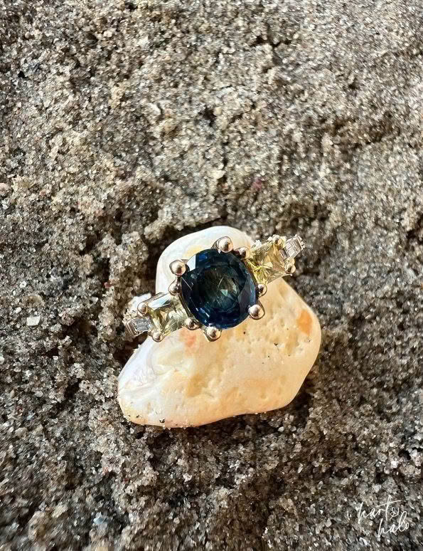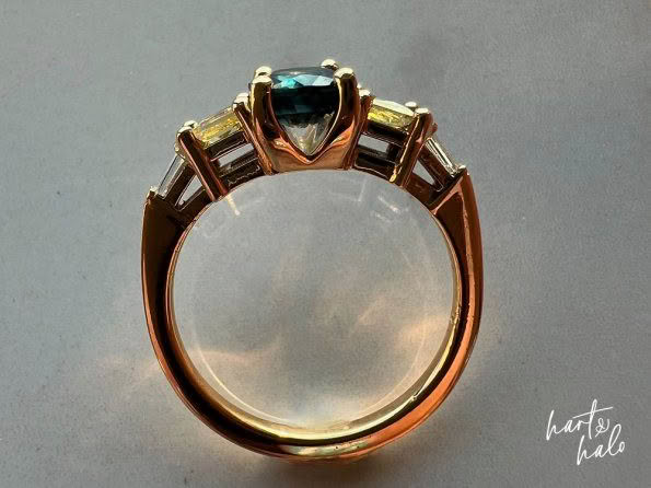From there though, the decision of what kind of design to create was not an easy one. After combing through Pinterest she realised she was a symmetrical fan, so we got to work with combining the beach theme, incorporating her kids, and wrapping it up in a symmetrical design – and it all started coming together. Renee liked the 5-stone design idea, and was keen to use yellow to represent her kids, so we sourced her 2x yellow princess cut Sapphires to hug in to her oceanic -themed Sapphire. From here a couple of tapered baguette Diamonds finished it off beautifully and allowed her ring to span the full width of her finger. Then down to details and she wanted her central Sapphire to ‘hang’ in its setting in a way that mirrored her engagement ring.