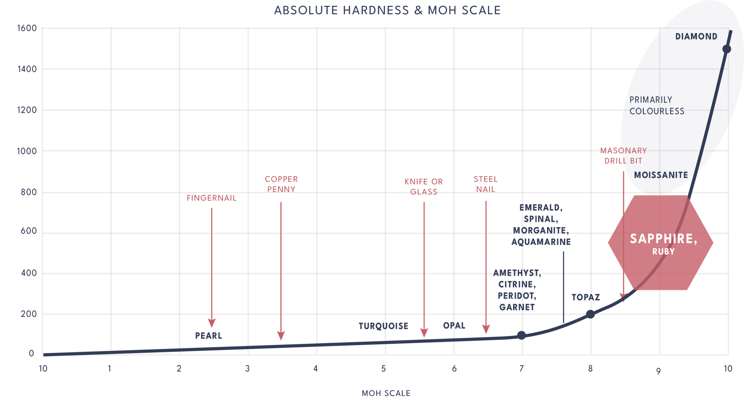 Sapphires rate 9 on the MOH scale, which is a scale used to describe the hardness of minerals, essentially rating the scratch resistance compared to other minerals. This scale was developed by Friedrich Mohs back in 1812 and is used widely within the industry. Diamond is top of this scale as the hardest known mineral at the time, with a rating of 10. The steps of this scale are not evenly spaced, there is actually an exponential relationship between them. So Diamond (at 10) is almost 4x harder than Sapphire (at 9) which is 2x harder than Topaz (at 8) etc. Stones with high wearability are rated at 9 and 10. Those that will require extra care and precautions are rated 8, and stones below 8 are not recommended for daily wear.
